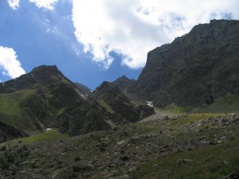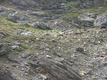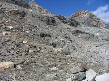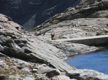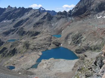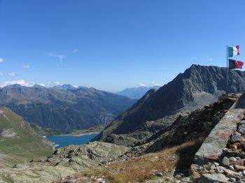 ![]() Zuerst kann man in der Bildmitte die zwei nachkommenden Personen kaum erkennen. Dann aber signalisiert in Richtung Süden der rote Punkt unser Tagesziel: Rifugio Perucca auf 2940 m am Lago del Dragone. Davor liegt noch der Gran Lago bei 2845 m. |