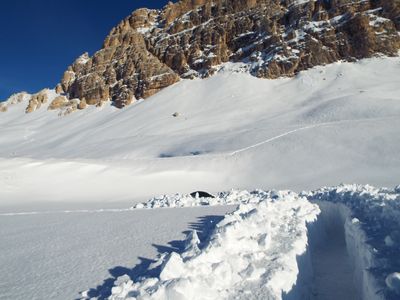Der Eingang des verbesserten Winterraumes der Auronzo Hütte