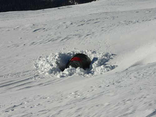 In 1,5 Stunden wurde das Loch in den Schnee gegraben, aber nicht bis zum Boden. Mit dem neuen Zelt benötigten wir etwa mehr Platz.