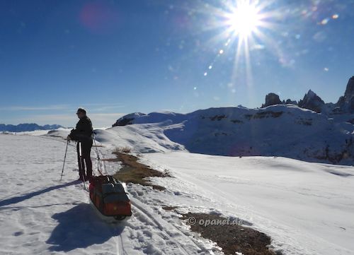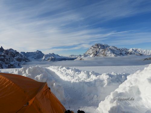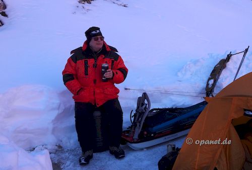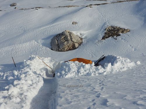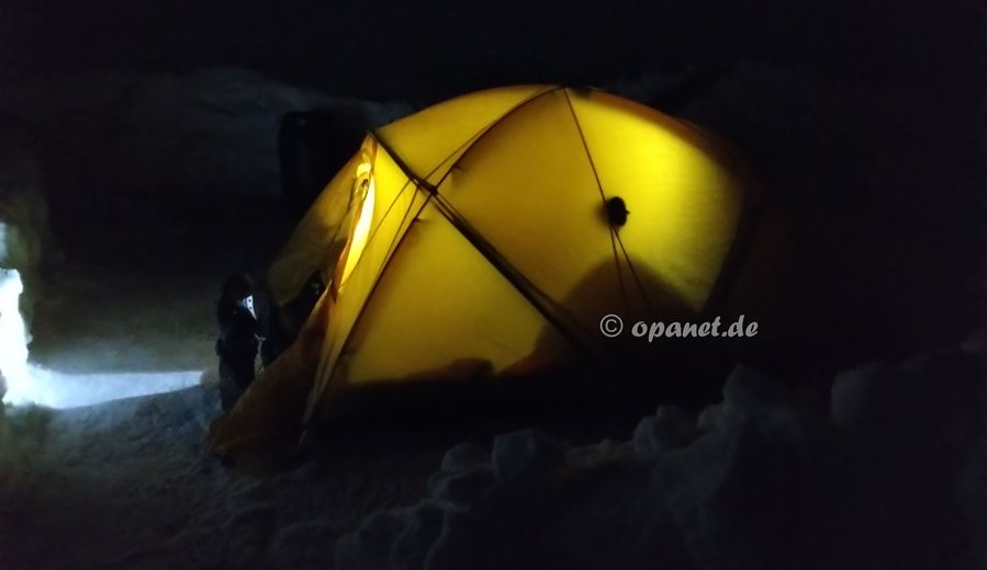 Am Aufstiegstag klingelte 06:30 Uhr der Wecker. Es gab nur leichten Frost und wir packten zügig die Pulkas. Ein kleines Frühstück (Tee, Speck,Brot, Kuchen) sollten ausreichen. So konnten wir kurz vor 09:00 Uhr bereits mit dem Aufstieg beginnen. Noch Mitte Dezember dachte ich, dass ich es diesmal nicht schaffen würde. Zu sehr wollten die Knie nicht. Mit 66 ist der Leistungsbereich anders als mit 25. Der psychologische Effekt lies alle Beschwerden verschwinden und es ging ganz gut nach oben. Trotzdem war die Kondition bei mir nicht ausreichend und ich benötigte 3 Stunden und 45 Minuten zum Ziel. Allerdings plante ich gleich von Beginn an mehrere Pausen ein, die auch notwendig waren. Dadurch war ich am Ziel nicht so fertig wie ein Jahr zuvor. Das Wetter spielte mit und die Sonne ballerte nicht ganz so stark. Das Schaufeln für das Zelt nahm dann 2 Stunden in Anspruch. Danach gab es ausreichend Tee, teilweise mit Zugabe, und es wurde das Silvesteressen vorbereitet. 17:30 Uhr oder 18:00 Uhr ging es dann in das Zelt. Die Sonne war bereits verschwunden und es wurde kalt. Kurz vor Mitternacht stehen wir auf, um die verschiedenen Silvester-Feuerwerke im Tal zu beobachten. Auch diesmal war das Feuerwerk in Cortina d'Ampezzo am gewaltigsten. Am zweiten Abend hatten wir sehr gute Outdoor-Pasta, die wir aus Finnland mitbrachten. |