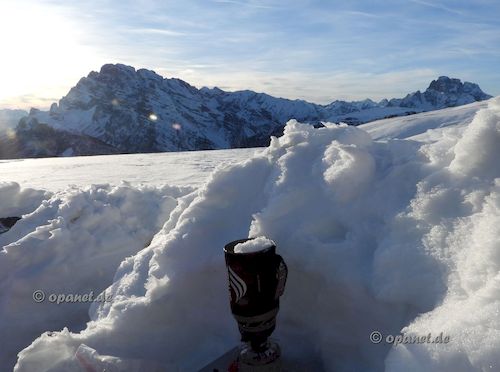 | Mit zwei mittleren Wintergas-Kartuschen sind wir gut über die Runden gekommen. Schnee gab es ja ausreichend und da das das Wetter sehr angenehm war, konnten wir uns bei der Wasserzubereitung auch Zeit lassen. Es gab Zeiten, da mussten wir wegen Schneesturm im Zelt den Schnee schmelzen. Was natürlich mehr Aufwand bedeutet und bei langem nicht so viel gemacht wurde. Nach dem Abstieg kehrten wir in der Malga Rin Bianco ein, zogen dann gemächlich unsere Pulken bis zum Auto und verstauten immer noch bei Sonnenschein unsere Ausrüstung. Auf dem Weg nach Hause besuchten wir wie immer den Weihnachtsmarkt in Bruneck, das Restaurant K1 und kauften in der Metro Bozen noch etwas ein. |