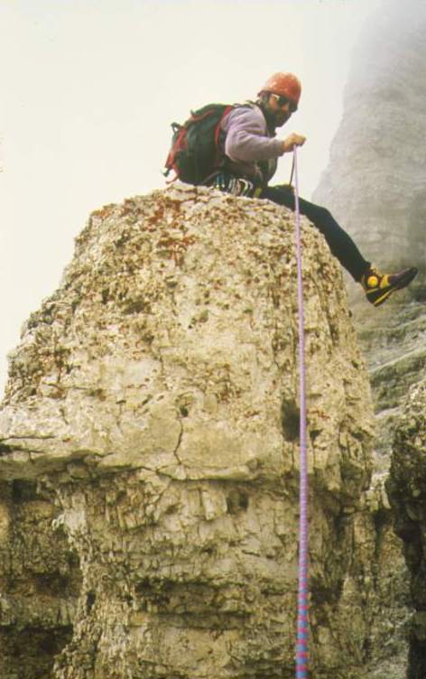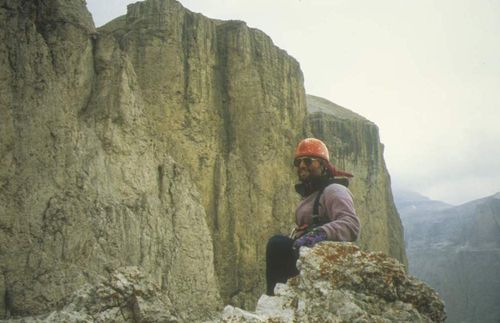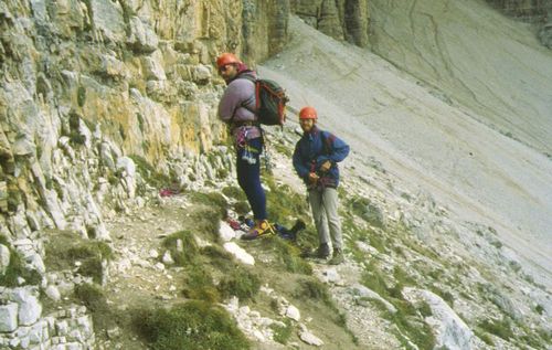 ![]() Vorbereitung für die Südkante der Pordoi-Spitze (links), 2952 m. Hier war es kalt. Bild rechtes: Die Route ist schön, Schwierigkeit V. Hat drei Quergänge, wobei einer 8 m und der 3. 15 m ist. Der letztere hat eine Sanduhr in der Mitte. 8 SL sind zu sichern, den Rest macht man frei. Wir sind im Weg. |