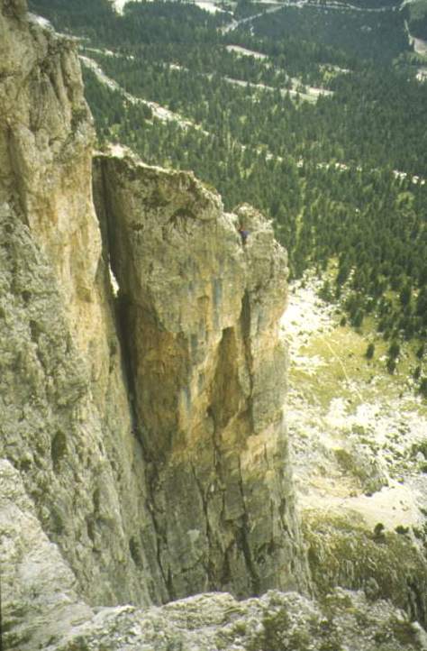 Der Südpfeiler des 1. Sellaturmes. Sehr zu empfehlende Genußroute. 4 Seillängen bei IV+ A0. Die Route verdient ein Sternchen. |