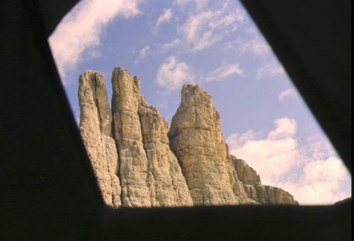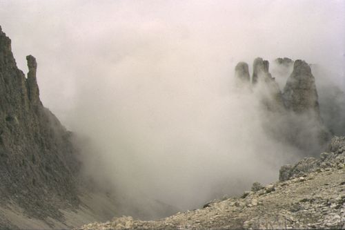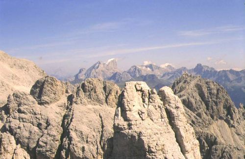 - Piazturm (2670 m), ist den südlichen Türmen vorgelagert (im Bild vor dem Delagoturm) und ist nur 40 m hoch.