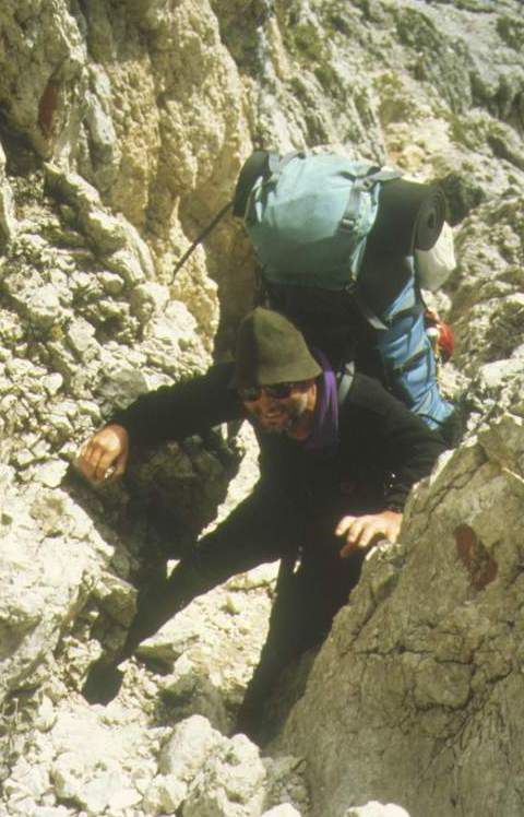 Südwand "Fehrmann" - 19.08.1908 R.Fehrmann, Oliver Perry Smith Direkte Einstiegsvariante Sommer 1935 G.B.Vinatzer, V.Peresti V(A0) Wechselführung, Schlüsselstelle überhängender Riß, sehr kalt (nachts minus 10° C, mittags +5°C), 5 SL ohne Zustieg