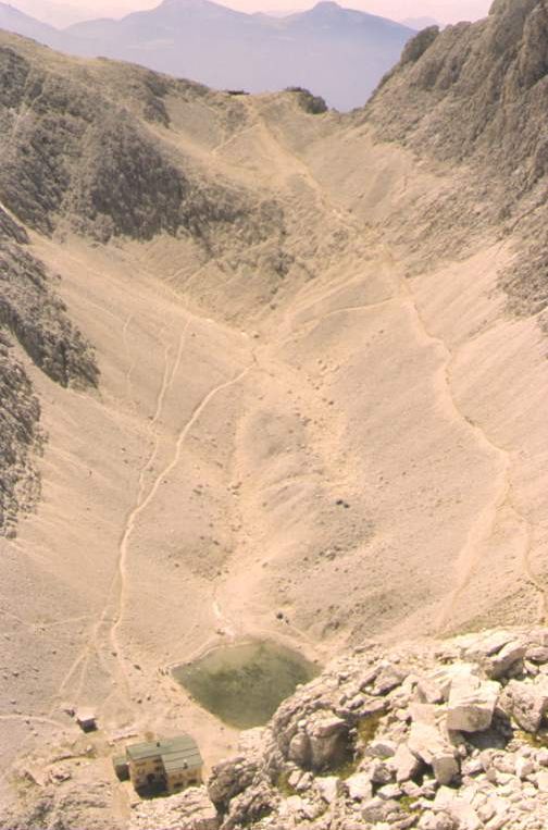 Erstbestiegen von Tita Piaz am 02.09.1899. Nordriß IV+ sehr zu empfehlen, ein Haken kam beim Standplatzbau vor dem Riß, gutes Wetter-Sonnenschein, 1 SL