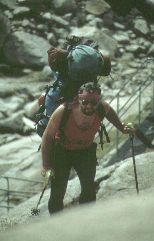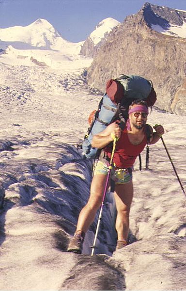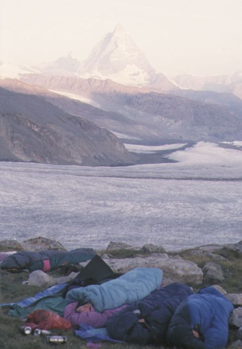 ![]() Links der Aufstieg mit vollem Gepäck kurz vor der Monte-Rosa-Hütte. Oben das Lager bei bestem Wetter im Freien. In der Ferne das Matterhorn. |