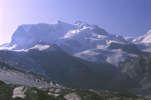 Genau in der Bildmitte die Dufourspitze. Links daneben mit dem langgezogenen Grat das Nordend (4609 m). Rechts neben der Dufourspitze die Zumsteinspitze (4573 m) und dann die Signalkuppe (4545 m). Aufgenommen vom Breithorn (4161 m). |