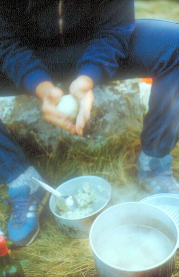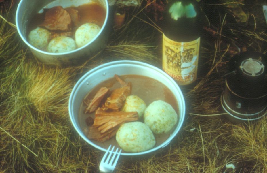 Das Essen wird serviert. Das Fleisch kam aus Konserven aus dem Rucksack.![]() Es kann nun keiner behaupten, dass es uns schlecht erging. |