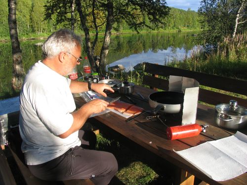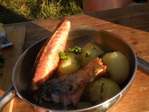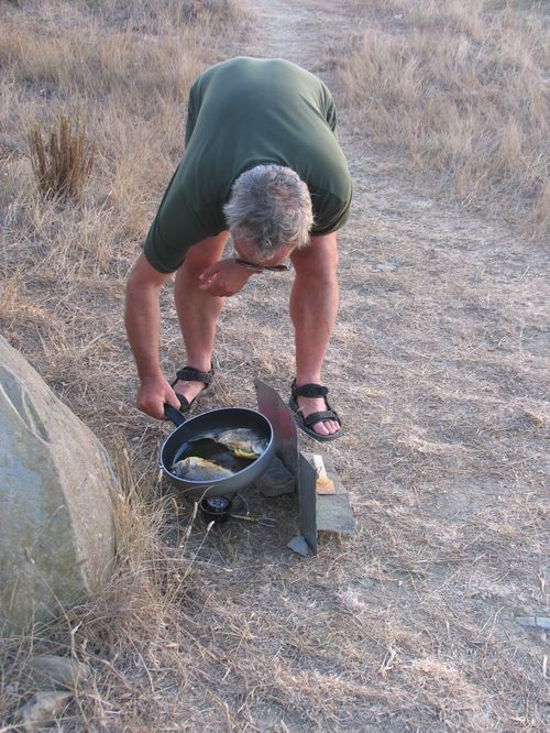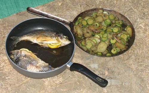 | In Italien an der Küste ist der Fisch besonders gut. Die Dorate war sehr lecker und weil wir etwas abseits vom Zelt kochten, wurde der Duft nicht von diesem angenommen. |