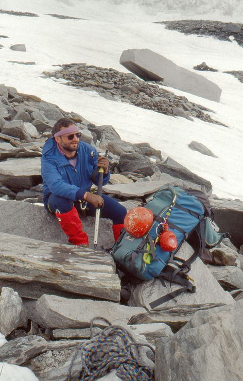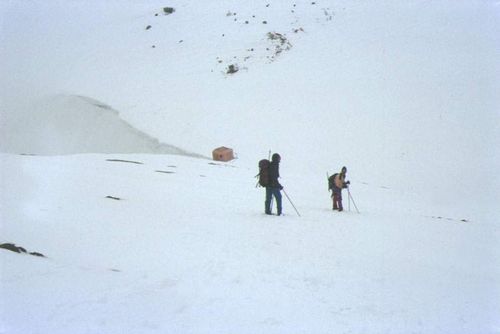 Ein gewaltiges Schneebrett am Gegenhang des Großen Wiesbachhorns riss einen Teilnehmer der anderen Seilschaft unserer Gruppe mit in die Tiefe. Er schwamm um sein Leben und blieb oben auf - unverletzt. Es war an seinem Geburtstag. An der Grubenschartenschachtel gab es eine Übernachtung. Der Sturm rüttelte stark an der Biwakschachtel, die nicht mehr an allen Seilen fest verankert war. Ich und ein weiterer Teilnehmer machten dem Neuling aber Angst, indem wir laut darüber nachdachten, was wohl passieren würde, wenn die Schachtel aus der Verankerung gerissen wird und wir nur noch an einem Stahlseil über die Kante hingen. Ja, er zog sich an und wollte in die Nacht hinaus → nur mit Mühe konnten wir ihn zurückhalten! |