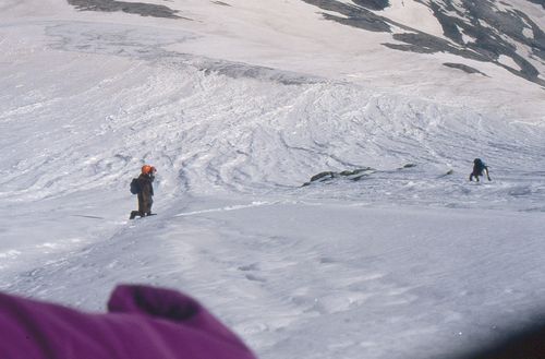 ![]() Ich warte. Beim Abstieg der 2. Gipfeltour zum Fuscherkarkopf wurde wie zur 1. Besteigung über die Nordwand abgefahren. Diesmal ging es aber nicht so gut und ich kam mit den Steigeisen in den Firn und überschlug mich mehrfach. |