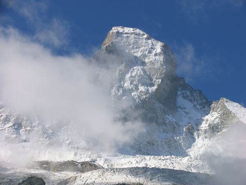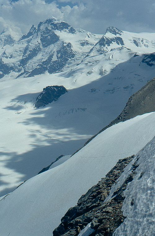![]() Bei einem der früheren Besuche am Matterhorn ging es auch zum Furgg-Grat. Im Bild oben meine Spur von schweizer Seite zum langen Grat. |