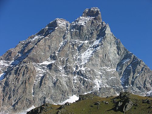 ![]() Das Ziel von Italien im Winter und rechte im Sommer. Links vom Matterhorngipfel der Pic Tyndall (4241 m) der ebenfalls überstiegen werden muss. |