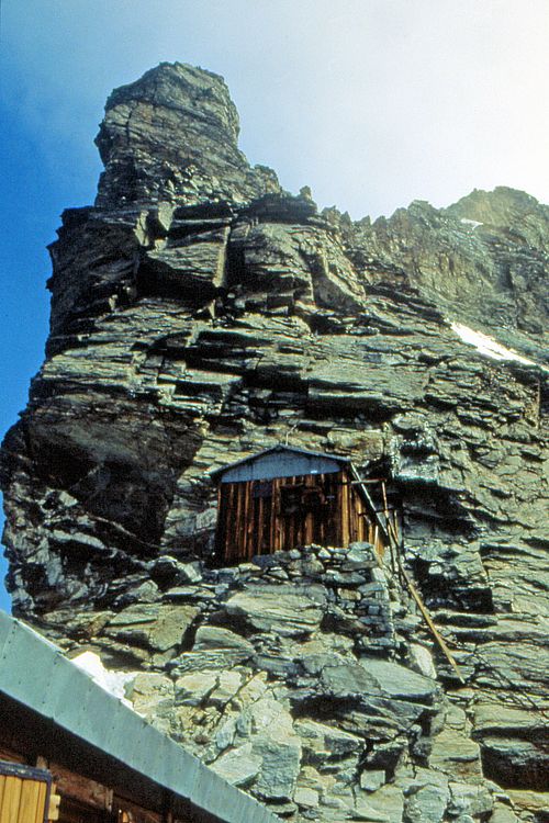 Rif. Carrel (3829 m), wurde inzwischen erneuert und die obere, hier zu sehende alte Hütte, steht mittlerweile in Breuil-Cervinia. Drei Seilschaften kamen über den Liongrat. Eine italienische Zweierseilschaft und wir mit zwei Zweierseilschaften: Fips und opa sowie Christian mit Thomas. Ankunftszeit: 11:05 Uhr |