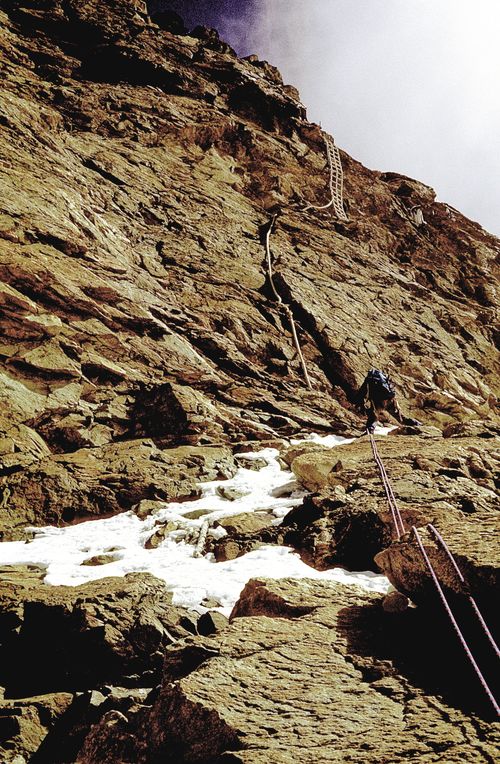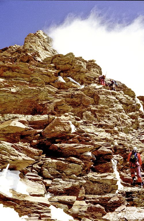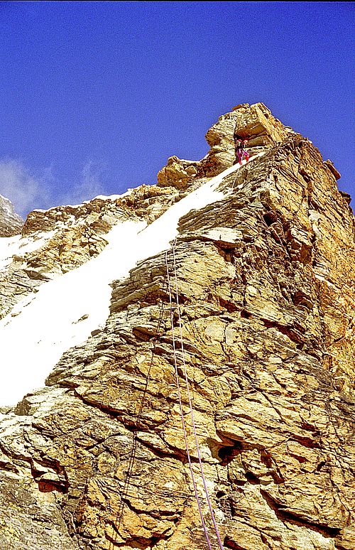 ![]() Der Abstieg dauerte auch seine Zeit, da wir fast durchgehend sicherten. Insgesamt gab es an den drei Tagen des Aufenthalts von uns am Berg mindestens fünf Tote. Wir konnten die schwarzen Säcke am Heli beobachten (2 Tage zuvor) und am Gipfeltag gab es Unfalltote auf schweizer Seite am Normalweg. Aus diesem Grund kam über den Normalweg auch niemand zum Gipfel und wir waren erstaunt, da wir den Grund noch nicht kannten. Rechts die Ketten unterhalb der unbewirtschafteten Hütte am Liongrat. Wir seilten hier ab. |
