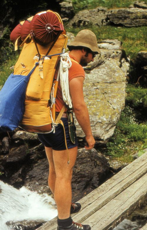 Der Zeltträger beim überqueren einer Brücke. Das Seil ist kein Kletterseil. |