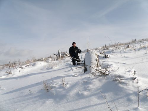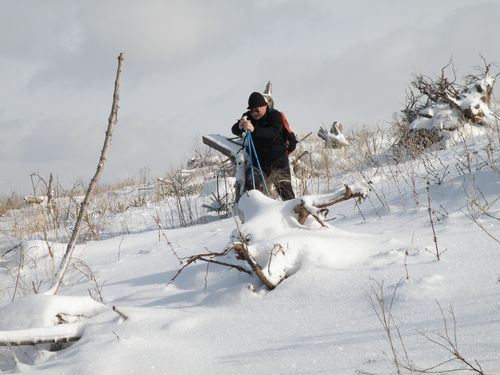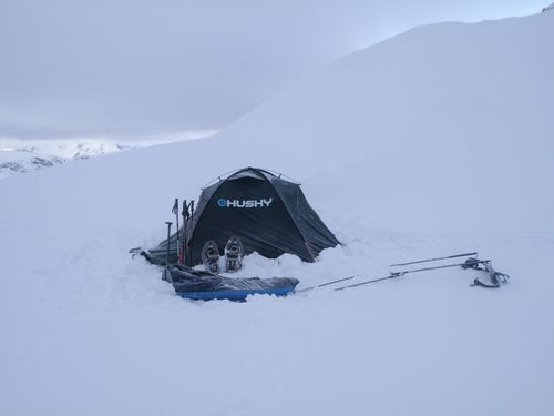 ![]() Mit Schneeschuhen, Pulka und Zelt. |