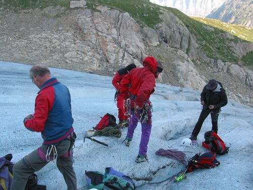 | Ausbildung auf dem Gletscher. Immer wieder wird wiederholt und die neuen Erkenntnisse umgesetzt. Im Notfall muss es fast blind von der Hand gehen. |