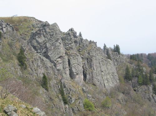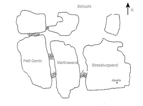 | Die Martinswand. Fester Granit, 60 Routen bis 80 m, gut gesichert. Übersicht der Felsanordnung. Vom Parkplatz (UTM WGS84: 32 U 352184 5323964) 150 m von der D430 auf dirktem Weg zur Martinswand. Auch mit einem kleinen Umweg (Parkplatz (UTM WGS84: 32 U 351504 5322205) über den dritthöchsten Berg der Vogesen: Hohneck mit 1363 m. Übernachtungen sind zahlreich vorhanden. Sehr preiswert sind die vielen Campingplätze, an denen man auch am Pfingstmontag frische Baguette bekommt. In der Vorsaison sind die Preise extra günstig. |