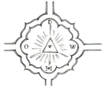 blauer Grund, weißes Auge, gelbe Strahlen, rote Buchstaben ODwH