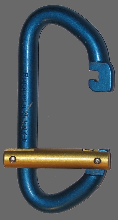 Bei einer Vereinsklettertour am Koppenstein setzte sich ein Teilnehmer in diesen Haken. Die Belastung muss so unwirklich gewesen sein, dass der Verschluss seine Position sich derartig verändert, wie es nicht sein sollte. Der Verschluss klemmt noch immer so und lässt sich nicht bewegen. Das Seil befand sich in der neu entstandenen Öse. |