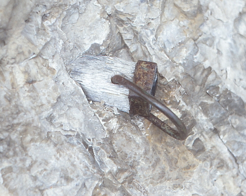 Bei einer sehr selten begangenen Tour, es war wohl die 3. Begehung, kam mir auf dem Seil vom Vorsteiger dieser Haken entgegen. Natürlich rief ich dies nicht nach oben. Warum?