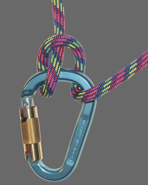 ![]() HMS-Knoten Halbmastwurfsicherungsknoten, also die Hälfte des Knotens rechts. Es ist der Sicherungsknoten im alpinen Bereich. Verwendung nur mit einem HMS-Karabiner, damit durch den größeren Radius der Knoten bei Belastung (Sturz, Reinhängen) auch umspringen kann. Die Hand wird nie vom Bremsseil genommen. Hier ist der Knoten an einem Self-Lock-HMS-Karabiner gemacht. |