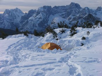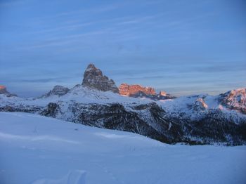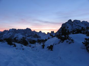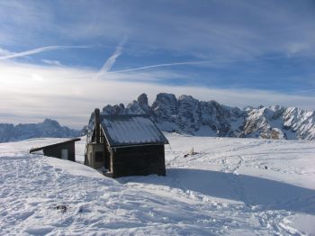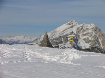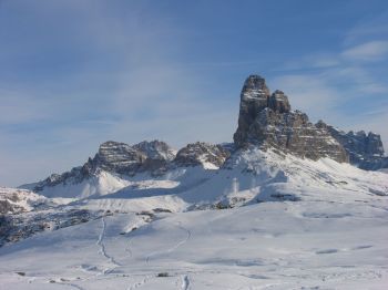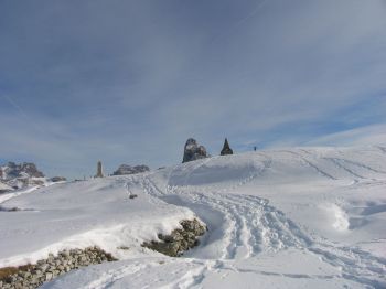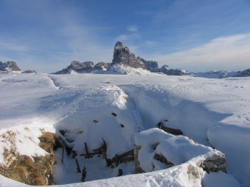 Im Winter sind die meisten Schützengräben, von denen es hier sehr viele gibt, zugeschneit. Dieses Gebiet war im 1. Weltkrieg hart umkämpft. Gerade hier auf dem Monte Piano, wo die österreichischen Kaiserjäger und die italienischen Alpini sich förmlich übereinander lagen, denn hier sprengten die Alpini über lange Stollen die feindlichen Stellungen, die darüber lagen, einfach in die Luft. |