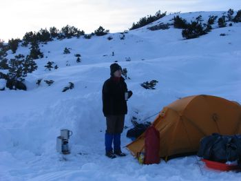 | Der nächste Morgen beginnt wieder mit herrlichem Winterwetter. Die Nacht war kalt (-10°C) und es kostete immer ein Überwindung, zum Wasserlassen den warmen Schlafsck zu verlassen. Die helle Mondnacht und der sternenklarer Himmel konnte trotzdem zum Verweilen vor dem Zelt animieren. |