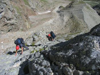 Die 1. Etappe ist vom Klettertechnischen der anspruchvollste Abschnitt. Zuerst etwa 800 Hm bis zum Einstieg des Klettersteiges, dann über 400 Hm über den Klettersteig, der gut gesichert ist und dann anderseitig wieder 300 Hm ohne Spur absteigen. Dies alles mit Rucksack, der neben der Ausrüstung auch Verpflegung für eine Woche beinhaltet. |