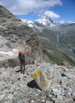 | Oben im zweiten Bild rot gepunktet der Verlauf des Klettersteiges. Eine kleine Klettersteigeinlage für 10 m Entfernung ist zu bewältigen, wer hier große Probleme hat, sollte umkehren. Niemals in das Coloire aufsteigen! Wechsel nach links auf Grat, große gelbe Kreismarkierung. Links zwei Ansichten des Plateau Rosa mit knapp 3500 m und dem Breithorn, 4161 m. |