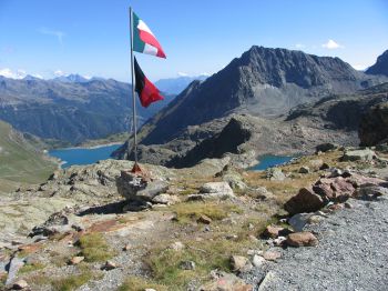 ![]() Zuerst kann man in der Bildmitte die zwei nachkommenden Personen kaum erkennen. Dann aber signalisiert in Richtung Süden der rote Punkt unser Tagesziel: Rifugio Perucca auf 2940 m am Lago del Dragone. Davor liegt noch der Gran Lago bei 2845 m. |