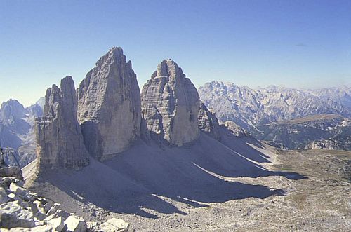 ![]() Die Drei Zinnen - Tre Cime di Lavaredo v.l.n.r.: Kleine Zinne, Große Zinne, Westliche Zinne. So fanden wir nicht die Normalroute zum Abstieg und biwakierten unterhalb des Gipfels bei -5°C. Am nächsten Morgen seilten wir auf der Südseite ab und sahen dann so aus. |