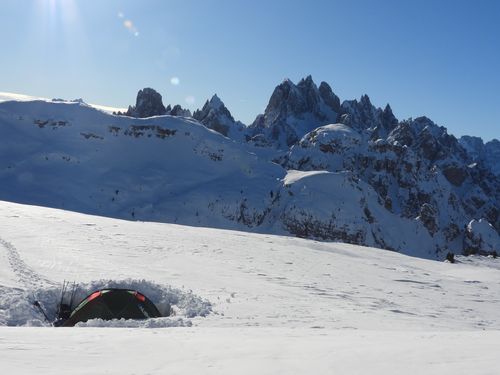 Jeden Tag schien die Sonne ohne Unterbrechung. Es kamen mit dem Motorschlitten Massen bis zur Auronzo-Hütte, die tagsüber öffnete und eine kleine Versorgung anbot.