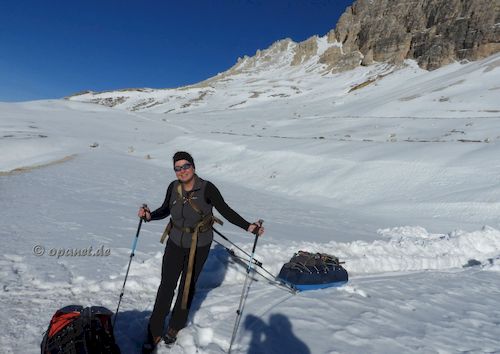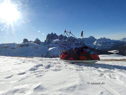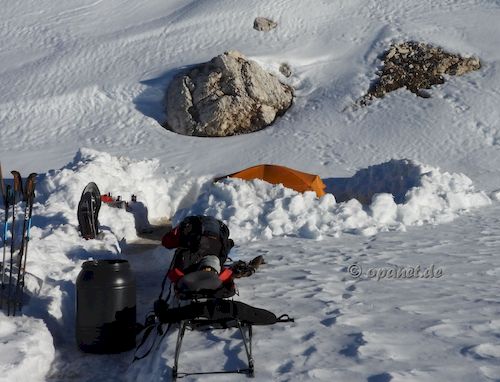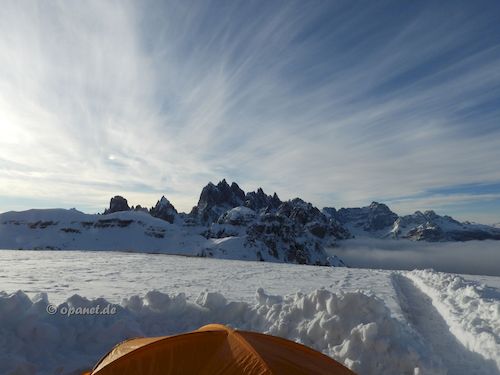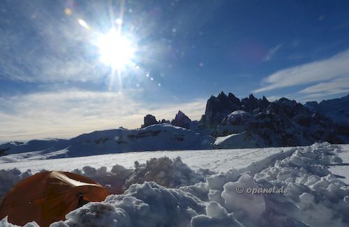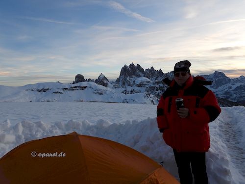 Am Aufstiegstag klingelte 06:30 Uhr der Wecker. Es gab nur leichten Frost und wir packten zügig die Pulkas. Ein kleines Frühstück (Tee, Speck,Brot, Kuchen) sollten ausreichen. So konnten wir kurz vor 09:00 Uhr bereits mit dem Aufstieg beginnen. Noch Mitte Dezember dachte ich, dass ich es diesmal nicht schaffen würde. Zu sehr wollten die Knie nicht. Mit 66 ist der Leistungsbereich anders als mit 25. Der psychologische Effekt lies alle Beschwerden verschwinden und es ging ganz gut nach oben. Trotzdem war die Kondition bei mir nicht ausreichend und ich benötigte 3 Stunden und 45 Minuten zum Ziel. Allerdings plante ich gleich von Beginn an mehrere Pausen ein, die auch notwendig waren. Dadurch war ich am Ziel nicht so fertig wie ein Jahr zuvor. Das Wetter spielte mit und die Sonne ballerte nicht ganz so stark. Das Schaufeln für das Zelt nahm dann 2 Stunden in Anspruch. Danach gab es ausreichend Tee, teilweise mit Zugabe, und es wurde das Silvesteressen vorbereitet. 17:30 Uhr oder 18:00 Uhr ging es dann in das Zelt. Die Sonne war bereits verschwunden und es wurde kalt. Kurz vor Mitternacht stehen wir auf, um die verschiedenen Silvester-Feuerwerke im Tal zu beobachten. Auch diesmal war das Feuerwerk in Cortina d'Ampezzo am gewaltigsten. Am zweiten Abend hatten wir sehr gute Outdoor-Pasta, die wir aus Finnland mitbrachten. |