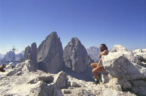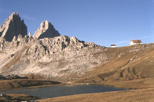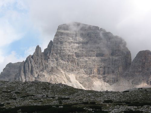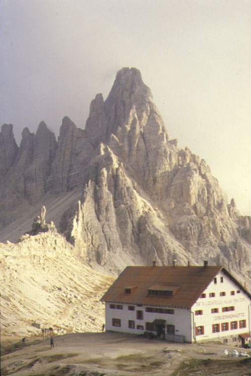 ![]() Im Bild oben: Unten die Böden-Seen rechts:Drei Zinnen Hütte links oben im Bild: die Große Zinne und die Westliche Zinne, dazwischen das Frankfurter Würstel. Diese Würstel wurde dann mit einer IV von uns am Abend, nach dem Essen mit Wein, genommen. Bild links: Drei Zinnen Hütte mit Frankfurter Würstel und der Paternkofel von Norden mit dem Nordnordostgrat. |