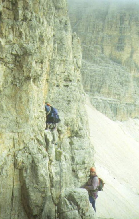 ![]() Vorbereitung für die Südkante der Pordoi-Spitze (links), 2952 m. Hier war es kalt. Bild rechtes: Die Route ist schön, Schwierigkeit V. Hat drei Quergänge, wobei einer 8 m und der 3. 15 m ist. Der letztere hat eine Sanduhr in der Mitte. 8 SL sind zu sichern, den Rest macht man frei. Wir sind im Weg. |