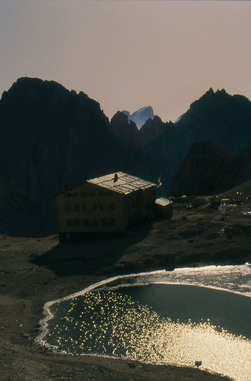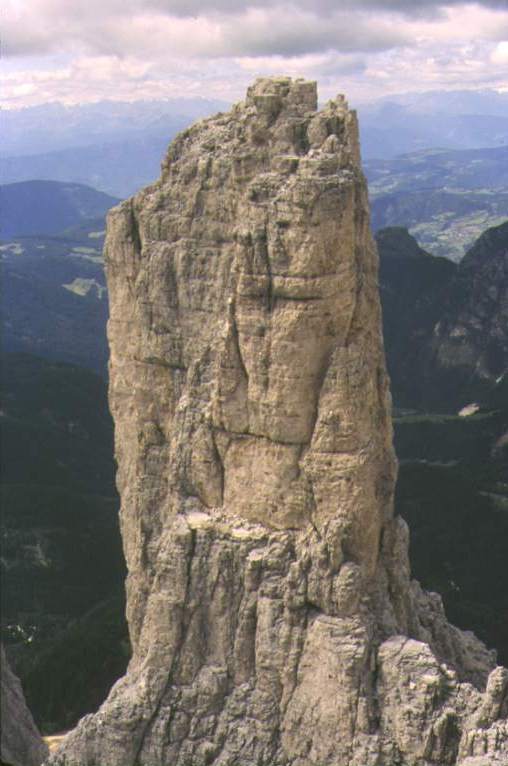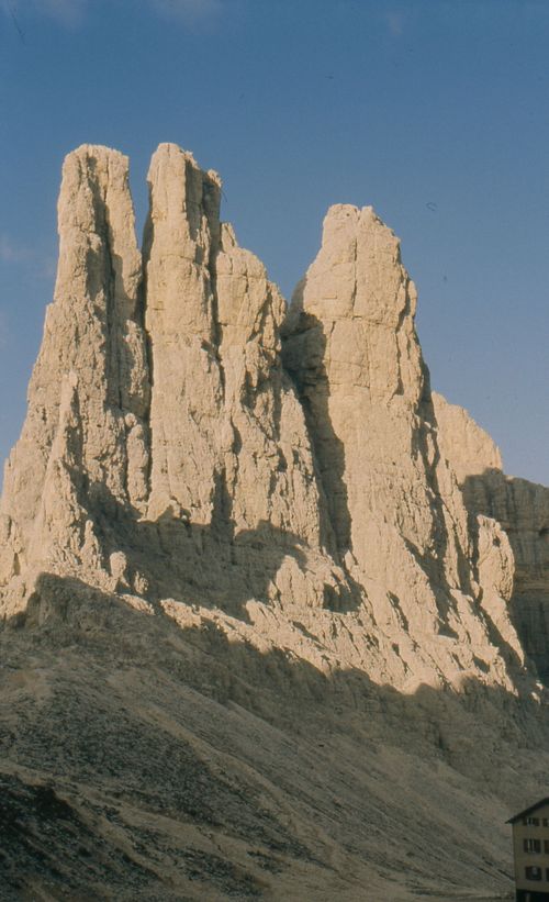 - Piazturm (2670 m), ist den südlichen Türmen vorgelagert (im Bild vor dem Delagoturm) und ist nur 40 m hoch.