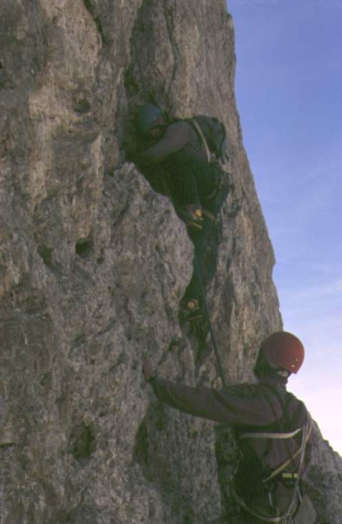 Erstbesteigung 1887 Georg Winkler über Südostwand wie wir als Wiederholer Südostwand "Winklerriß" IV+ 7 SL, sehr kalt (mittags +5°C)