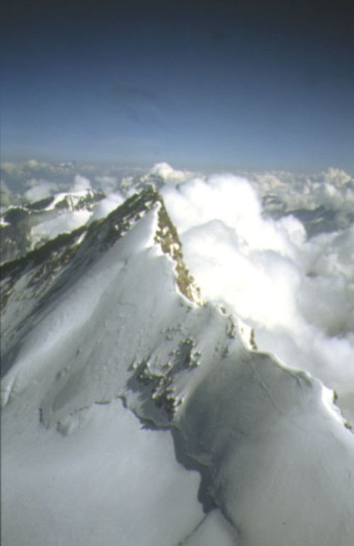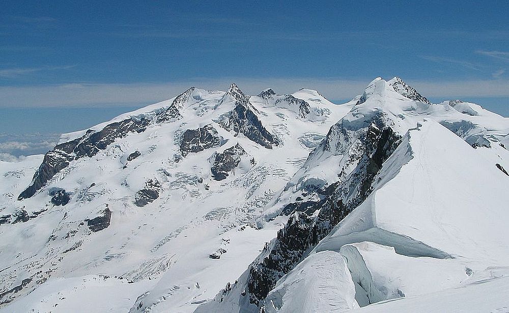 Genau in der Bildmitte die Dufourspitze. Links daneben mit dem langgezogenen Grat das Nordend (4609 m). Rechts neben der Dufourspitze die Zumsteinspitze (4573 m) und dann die Signalkuppe (4545 m). Aufgenommen vom Breithorn (4161 m). |
