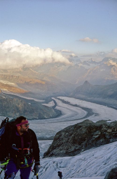 Oben links der Grenzgipfel (4618 m), oben rechts im Hintergrund die Signalkuppe (4545 m), davor die Zumsteinspitze (4573 m). Links das Nordend (4609 m). Beim Abstieg über den aperen Monte-Rosa-Gletscher. |