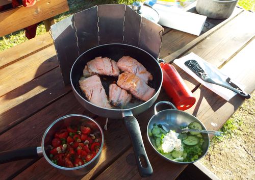 | In Italien an der Küste ist der Fisch besonders gut. Die Dorate war sehr lecker und weil wir etwas abseits vom Zelt kochten, wurde der Duft nicht von diesem angenommen. |