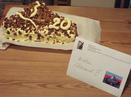 | 2013 zum Jubiläum meiner Matterhornbesteigung gab es meine Lieblingstorte 'Frankfurter Kranz' nach mütterlichem Rezept in Form des Berges. |