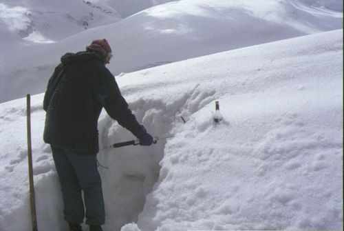 ![]() Vor der Tour wird ein Schneeprofil den Teilnehmern erklärt, die dann selbst eines machen müssen. Danach wurde die Tour für den nächsten Tag vorbereitet. Da die Wetteraussichten sehr trübe waren, erstellten wir eine Wegeskizze. Diese Wegeskizze wurde dann auch benötigt und penibel umgesetzt. In diesen Tagen im Mai gab es mehrere ungewollte und auch gefährliche Ereignisse. Die Wegskizze musste bis kurz nach der Scharte zwischen Mittleren und Großen Bärenkopf umgesetzt werden. Eine Seilschaft die am nächsten Tag nachkam, fragte uns, wer denn hier im Zick-Zack unterwegs war. |