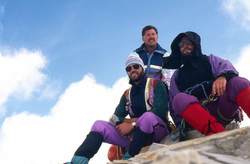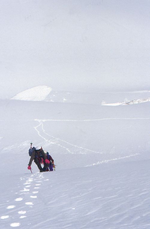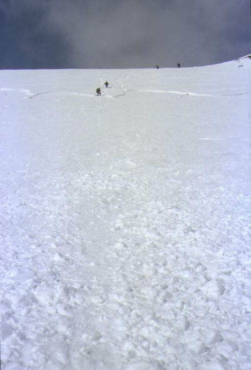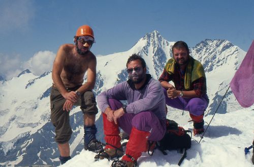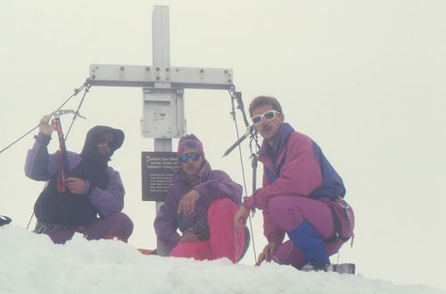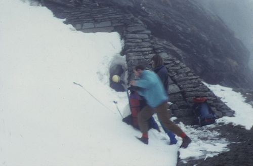 Ein gewaltiges Schneebrett am Gegenhang des Großen Wiesbachhorns riss einen Teilnehmer der anderen Seilschaft unserer Gruppe mit in die Tiefe. Er schwamm um sein Leben und blieb oben auf - unverletzt. Es war an seinem Geburtstag. An der Grubenschartenschachtel gab es eine Übernachtung. Der Sturm rüttelte stark an der Biwakschachtel, die nicht mehr an allen Seilen fest verankert war. Ich und ein weiterer Teilnehmer machten dem Neuling aber Angst, indem wir laut darüber nachdachten, was wohl passieren würde, wenn die Schachtel aus der Verankerung gerissen wird und wir nur noch an einem Stahlseil über die Kante hingen. Ja, er zog sich an und wollte in die Nacht hinaus → nur mit Mühe konnten wir ihn zurückhalten! |