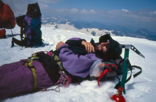 ![]() Ich warte. Beim Abstieg der 2. Gipfeltour zum Fuscherkarkopf wurde wie zur 1. Besteigung über die Nordwand abgefahren. Diesmal ging es aber nicht so gut und ich kam mit den Steigeisen in den Firn und überschlug mich mehrfach. |