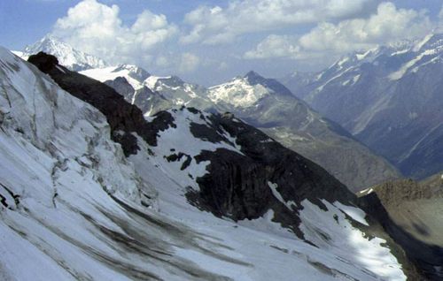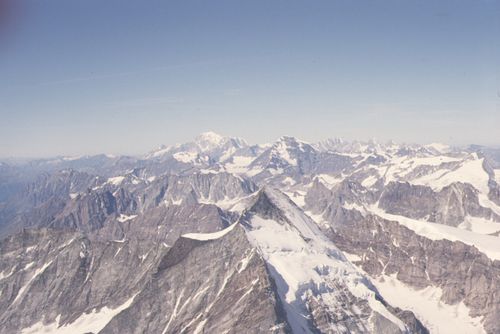 ![]() Blick vom Gipfel gen Süden. Im Vordergrund der Dent d'Hérens (4171 m) und im Hintergrund der Mont Blanc (4810 m). |
