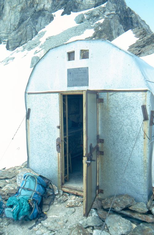 ![]() Am Bivacco Bossi (3345 m) war erst einmal Schluss. Koordinaten UTM- WGS84: OST 396988 NORD 5091940. |