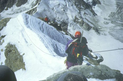 ![]() Der Abstieg dauerte auch seine Zeit, da wir fast durchgehend sicherten. Insgesamt gab es an den drei Tagen des Aufenthalts von uns am Berg mindestens fünf Tote. Wir konnten die schwarzen Säcke am Heli beobachten (2 Tage zuvor) und am Gipfeltag gab es Unfalltote auf schweizer Seite am Normalweg. Aus diesem Grund kam über den Normalweg auch niemand zum Gipfel und wir waren erstaunt, da wir den Grund noch nicht kannten. Rechts die Ketten unterhalb der unbewirtschafteten Hütte am Liongrat. Wir seilten hier ab. |